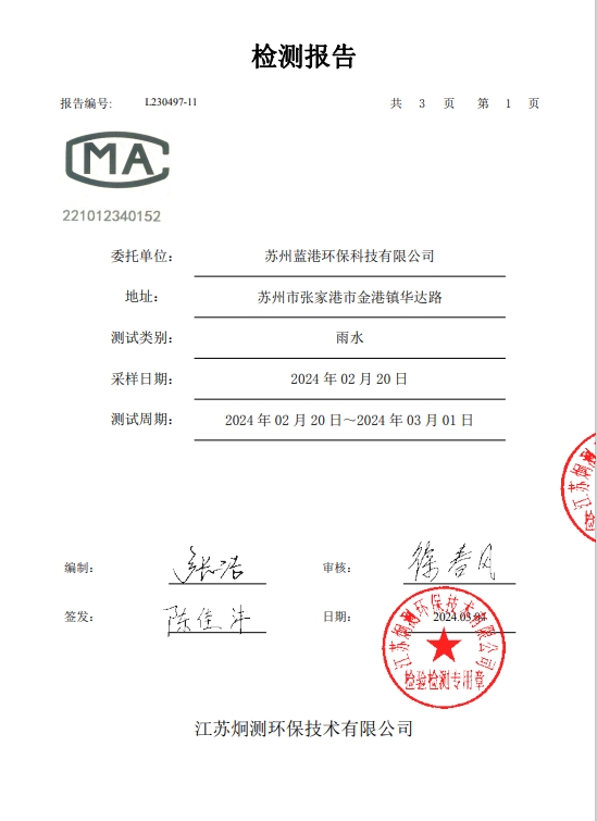 蘇州藍港環(huán)保科技有限公司檢測報告已公示,詳情請查...